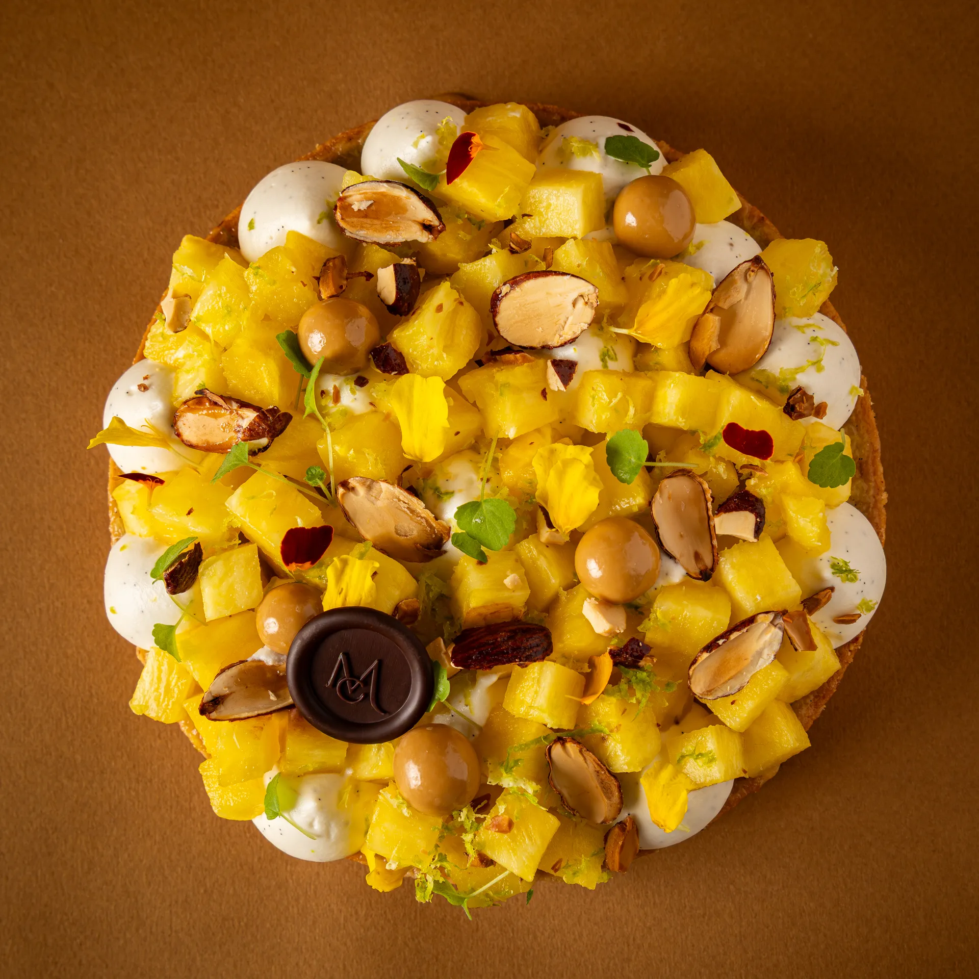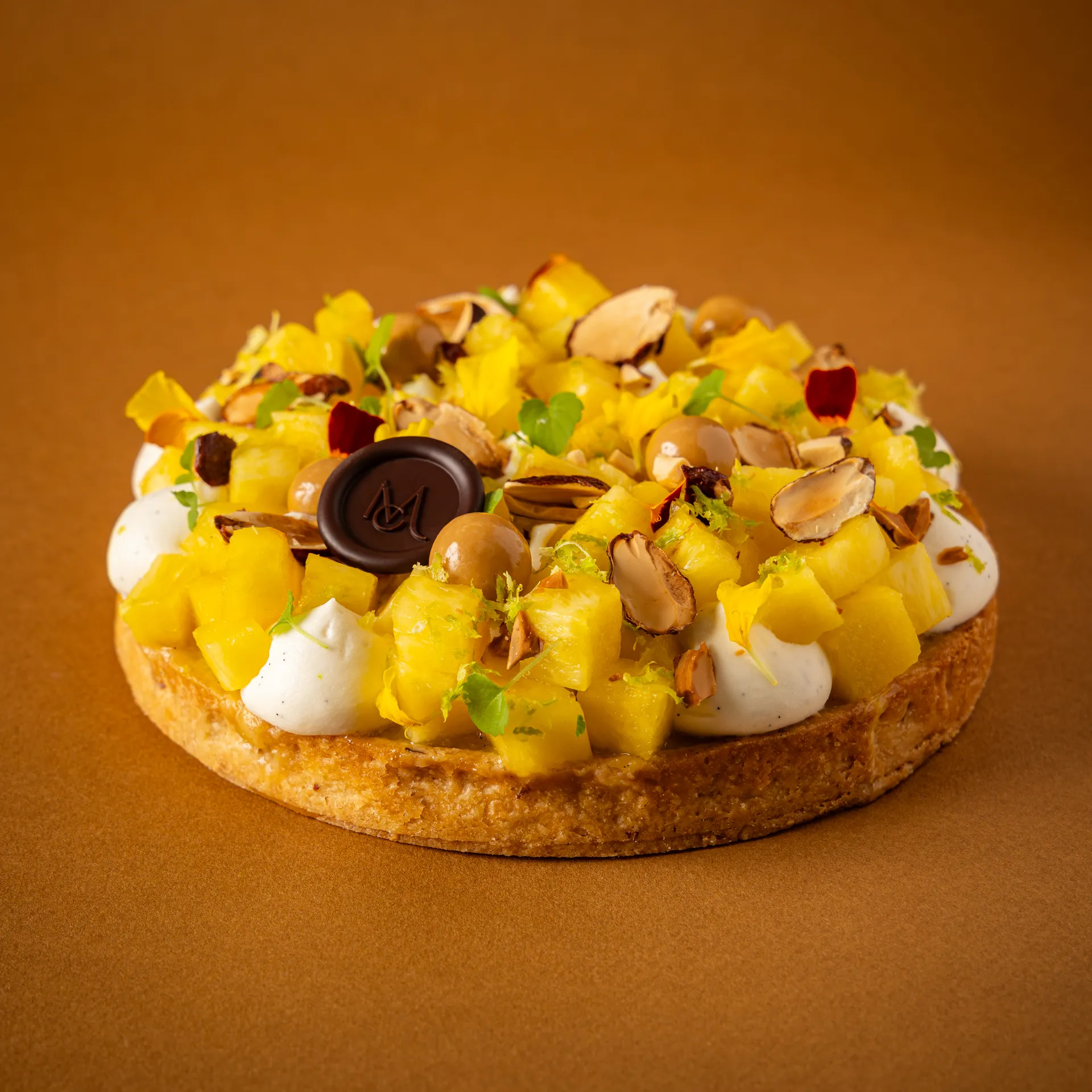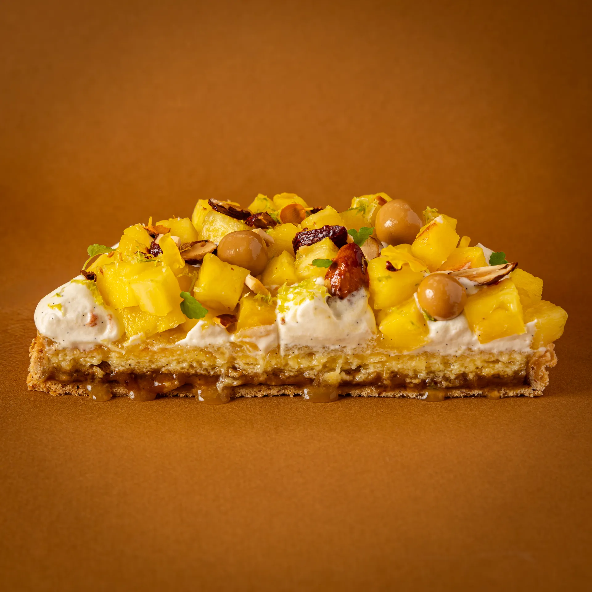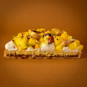 Pâte sablée croustillante et praliné coco, pointe de caramel à la fleur de sel et explosion d’ananas fraichement coupés.